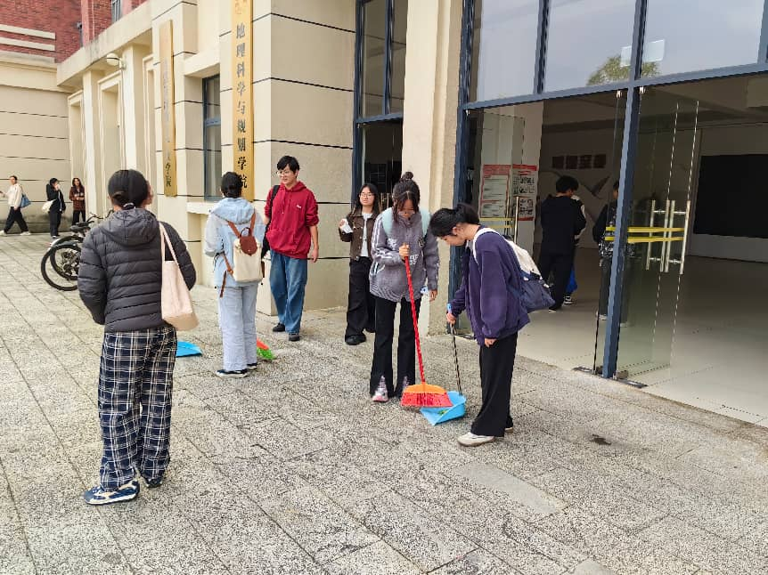 12月11日下午,南宁师范大学地理科学与规划学院2024级地科五班全体同学在武鸣校区地海楼、图书馆与中庭北面草坪周边开展了劳动教育实践的清扫活动。