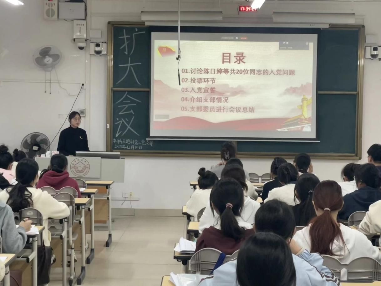 12月10日,地理科学与规划学院本科生地科第二党支部在武鸣校区1号教学楼220教室顺利召开2025下半年扩大会议。会议由党员谭秋莹主持,党支部全体成员参加。