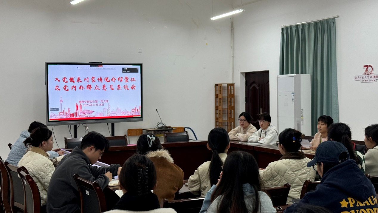 11月18日,地理科学与规划学院地理学研究生第一党支部在武鸣校区地源楼C401室以线上线下相结合的形式,召开发展对象候选人党内外群众意见座谈会。会议由党支部书记韦萍萍主持,学院党委组织委员孔提英老师线上指导,党支部支委、党内外群众代表等共同参与。