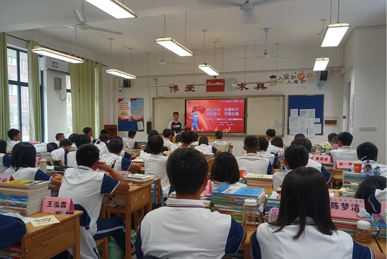 (实习老师黄远军在高一1班开展“九一八事变”主题班会)