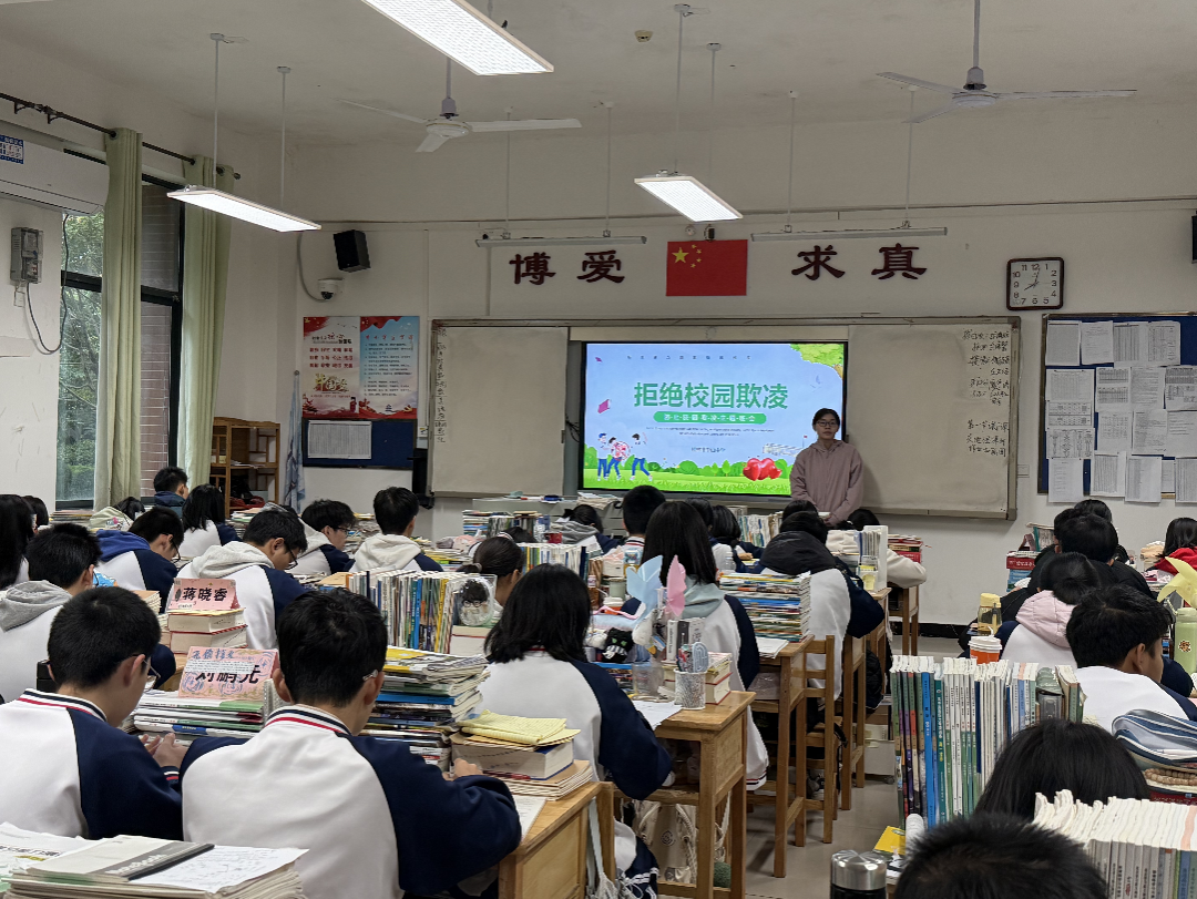 (实习老师陈俪丹在高一5班开展“拒绝校园欺凌”主题班会)