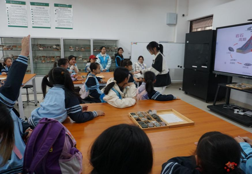 随后,研学队伍走进地质标本室。橱窗内陈列的各类岩石、矿物及化石标本,让同学们目不暇接。志愿者耐心引导大家近距离观察标本的纹理、色泽等特征,将抽象的地质知识转化为直观可感的学习体验,帮助同学们建立起对地球演化的初步认知。