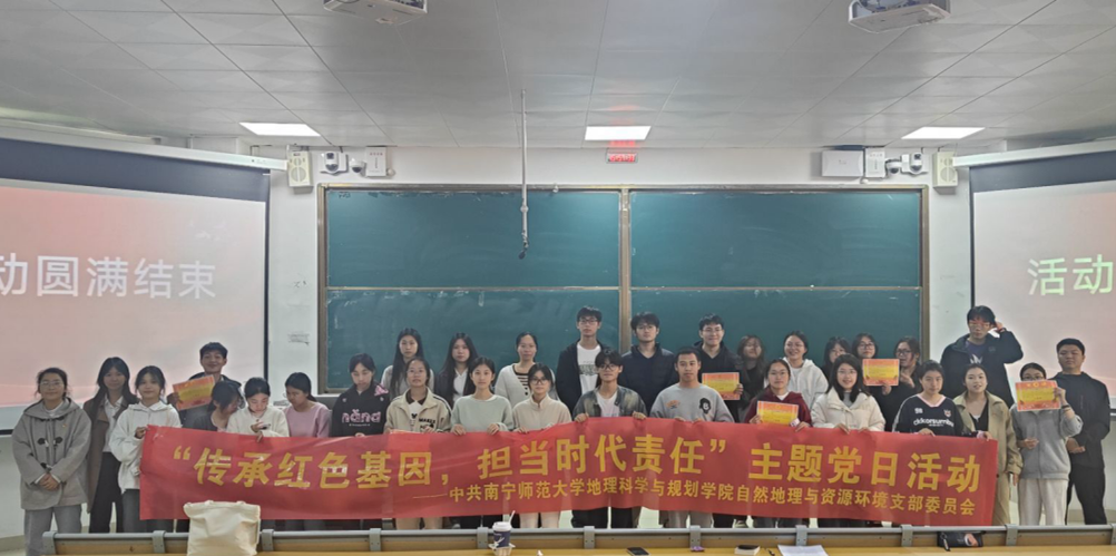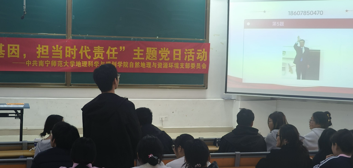 11月30日,地理科学与规划学院本科生自然党支部于武鸣校区一号教学楼114教室开展“传承红色基因,担当时代责任”主题党日活动。此次活动由党员郭香凝主持,党支部全体成员、学院各年级积极分子代表及学生代表共同参与。